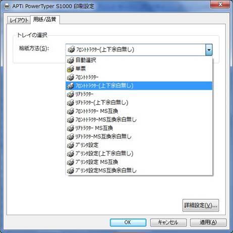 アプリケーション上では用紙サイズ内に収めているつもりでも、印刷した結果、1ページに収まりきらず2ページにわたってしまう場合は、ここの指定を「xxトラクター」から「xxトラクター(上下余白無し)」へ変更することで改善できることがあります。
